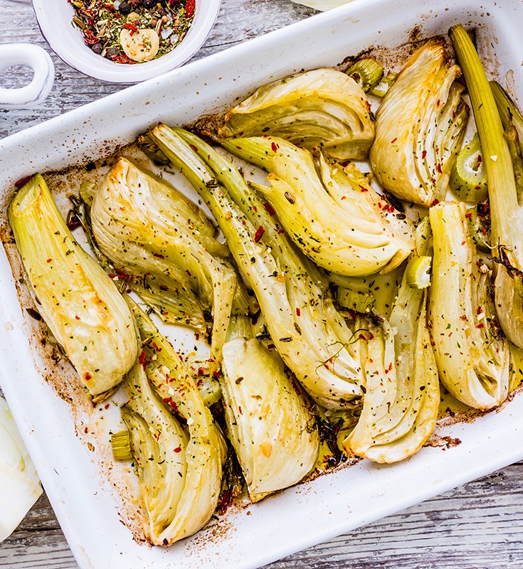 Pieczone fenkuły doskonale smakują w zestawieniu ze smażoną rybą.